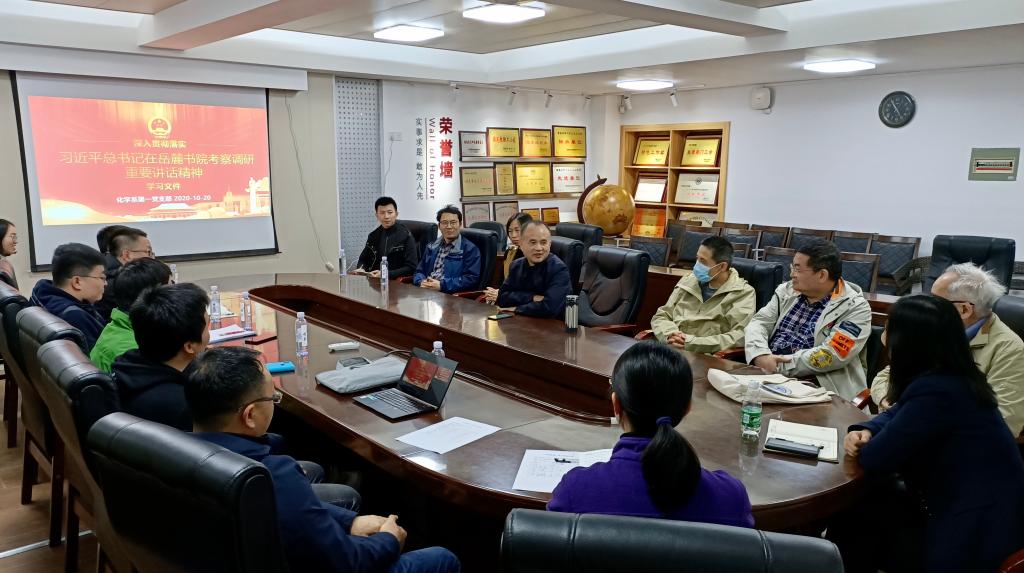 重要讲话精神”,化学系第一党支部于10月20日下午4:30在新化工楼D区204会议室召开学习研讨会,支部全体党员参加,张晓兵院长、王玉枝书记、俞汝勤院士出席。