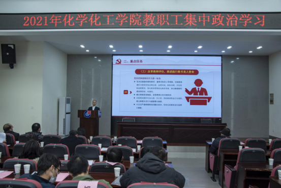 在新化工楼报告厅举行全院教职工集中政治理论学习,院长张晓兵宣讲《深化新时代教育评价改革总体方案》,全体教职工参会。