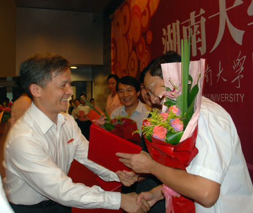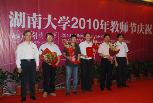 “我热爱湖南大学、热爱我的学生。我这一生做不成伟人,但却可做得崇高;我这一生干不成伟业,但可做得敬业。”在教师节颁奖典礼上,有一位特殊的获奖者深深打动了在场的每一位教师。他就是第四届师德标兵特别奖获得者、化学化工抢庄牛牛官方网站 教授蔡炳新。蔡教授身患癌症,带病坚持在教学、科研第一线,因病不能到场领奖。现场播放的反映蔡教授先进事迹的视频《病榻上的“承诺”》赢得了全场雷鸣般的掌声。