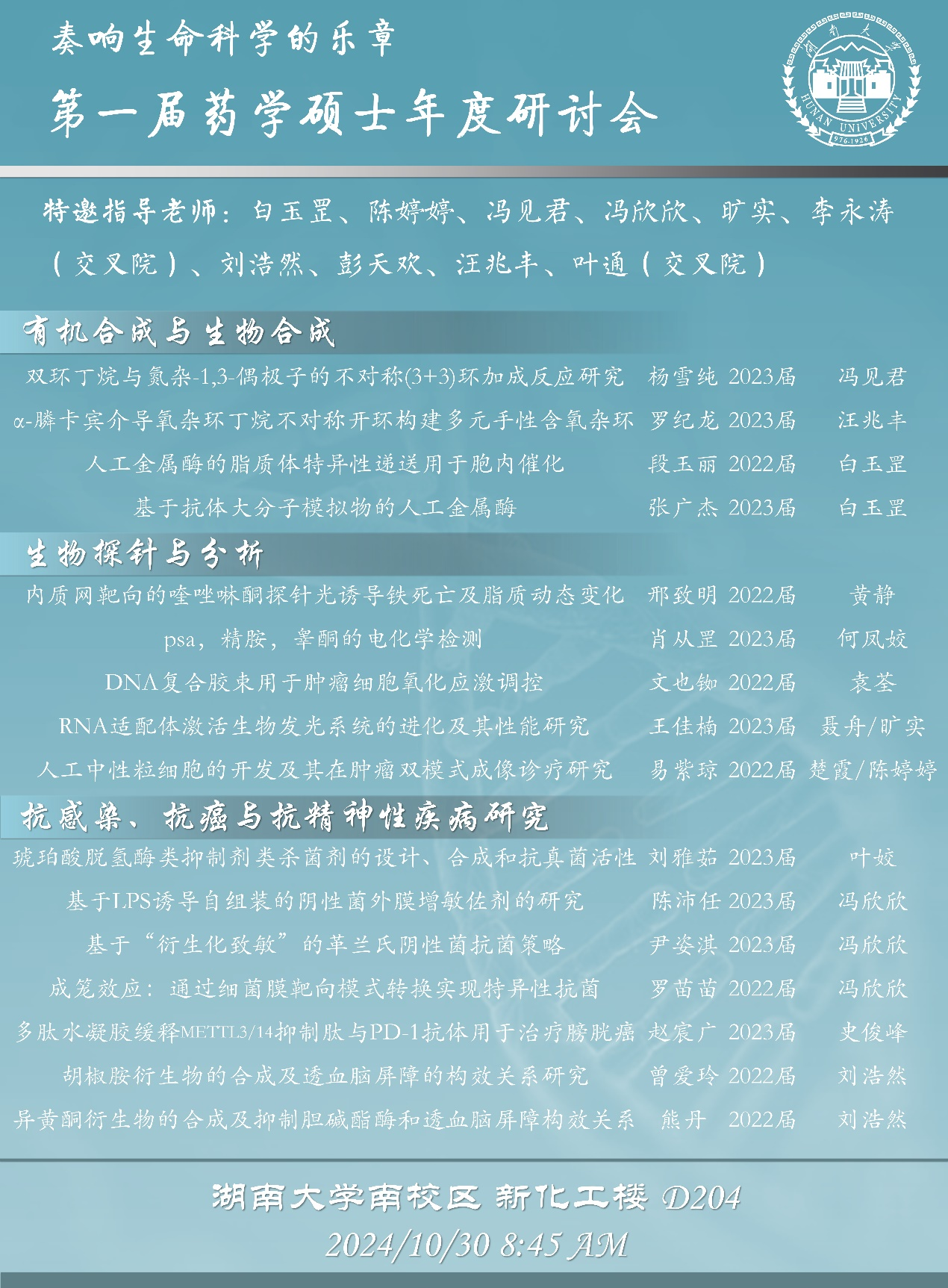 药学学科负责人冯欣欣老师主持,邀请了白玉罡、陈婷婷、冯见君、旷实、刘浩然、彭天欢、汪兆丰及生命医学交叉研究院的李永涛、叶通等多位教师指导。此次活动吸引了2022级和2023级硕士研究生踊跃参与,报名率分别达到60%和47%,充分展现了药学硕士研究生的科研热情。
