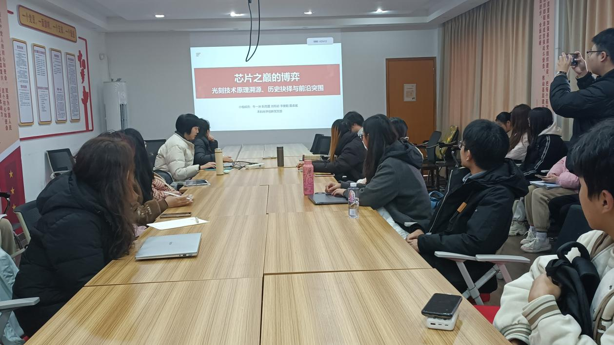 活动伊始,支部党员首先介绍了本次活动的核心主旨与现实意义。她指出,光刻胶作为芯片制造的“灵魂材料”,是连接化学合成、材料科学与半导体产业的关键纽带,其技术自主可控直接关系到国家产业链供应链安全。此前,支部以碳、氢、氧、氮和稀土元素等元素为切入点,搭建了学科知识与红色信仰的沟通桥梁,此次聚焦光刻胶这一高端化工材料,既是对系列主题活动的深化拓展,也是青年党员立足学科回应国家“卡脖子”技术难题的生动实践。